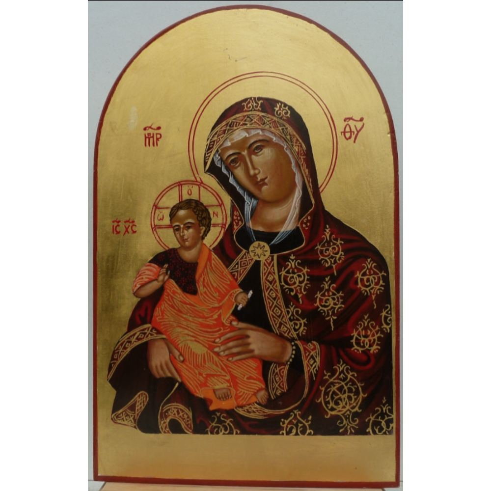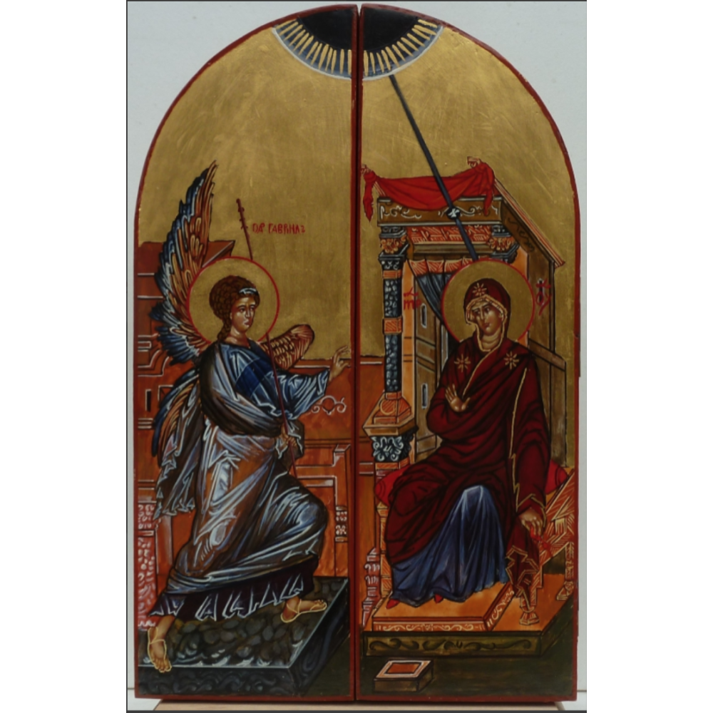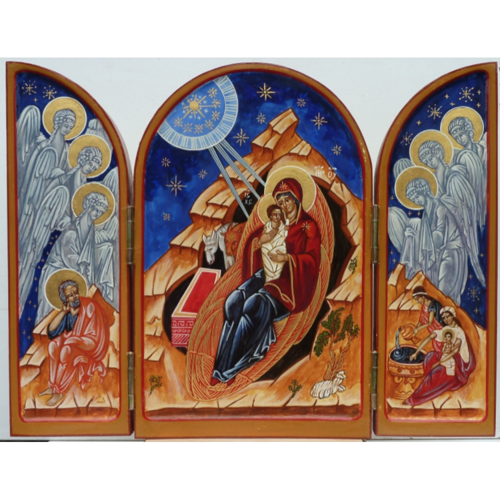 Deze icoon is er in de maat: Uitgeklapt 27 x 34,5 cm ; Dicht 27 x 17,5 cm Deze icoon is zowel aan de voor-, achter, als binnenzijde beschilderd.